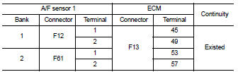 4. Check the continuity between A/F sensor 1 harness connector and ECM harness connector.
