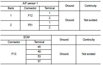 5. Check the continuity between A/F sensor 1 harness connector and ground, or ECM harness connector and ground.