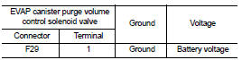 4. Check the voltage between EVAP canister purge volume control solenoid valve harness connector and ground.