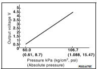 The EVAP control system pressure sensor detects pressure in the purge line. The sensor output voltage to the ECM increases as pressure increases.