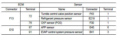 • Crankshaft position sensor (POS) (Refer to EC-281, "Component Inspection".) • Refrigerant pressure sensor (Refer to EC-482, "Diagnosis Procedure".) • Tumble control valve position sensor (Refer to EC-410, "Diagnosis Procedure".) Is the inspection result normal? YES >> GO TO 8.