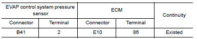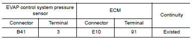 3. Check the continuity between EVAP control system pressure sensor harness connector and ECM harness connector.