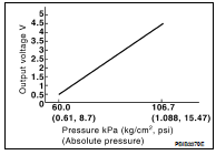 The EVAP control system pressure sensor detects pressure in the purge line. The sensor output voltage to the ECM increases as pressure increases.