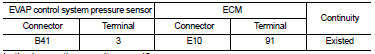 3. Check the continuity between EVAP control system pressure sensor harness connector and ECM harness connector.