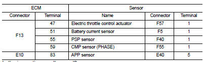 • Battery current sensor (Refer to EC-380, "Component Inspection".) • Power steering pressure sensor (Refer to EC-355, "Component Inspection".) • Camshaft position sensor (PHASE) (Refer to EC-284, "Component Inspection".) Is the inspection result normal? YES >> GO TO 5.
