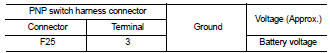 4. Check voltage between PNP switch harness connector F25 terminal 3 and ground.
