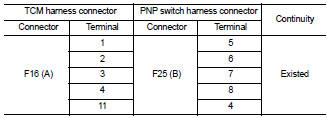 3. Check continuity between TCM harness connector F16 (A) terminal 1, 2, 3, 4, 11 and PNP switch harness connector F25 (B) terminal 5, 6, 7, 8, 4.