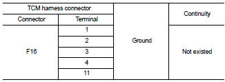 Check continuity between TCM harness connector F16 terminal 1, 2, 3, 4, 11 and ground.