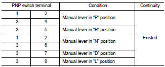 2. Check continuity PNP switch connector terminals. Refer to TM-308, "Component Inspection (Park/Neutral Position Switch)" Is the inspection result normal? YES >> Adjust CVT position. Refer to TM-429, "Inspection and Adjustment".