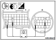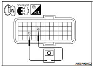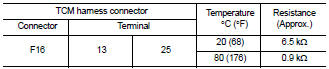 3. Check resistance between TCM harness connector F16 terminal 13, 25.