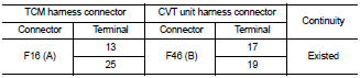 2. Check continuity between TCM harness connector F16 (A) terminal 13, 25 and CVT unit harness connector F46 (B) terminal 17, 19.