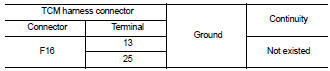 Check continuity between TCM harness connector F16 terminal 13, 25 and ground.