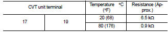 3. Check that output voltage of CVT fluid temperature sensor is within the range specified below.