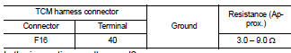 3. Check resistance between TCM harness connector F16 terminal 40 and ground.