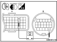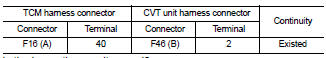 2. Check continuity between TCM harness connector F16 (A) terminal 40 and CVT unit harness connector F46 (B) terminal 2.