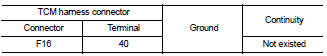 Check continuity between TCM vehicle side harness connector F16 terminal 40 and ground.