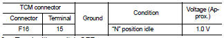 2. Check voltage between TCM harness connector F16 terminal 15 and ground.