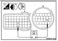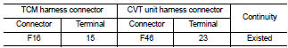 3. Check continuity between TCM harness connector F16 (A) terminal 15 and CVT unit harness connector F46 (B) terminal 23.