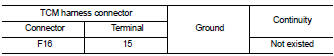 Check continuity between TCM harness connector F16 terminal 15 and ground.