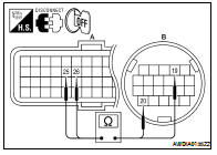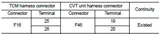 3. Check continuity between TCM harness connector F16 (A) terminals 25, 26 and CVT unit harness connector F46 (B) terminals 19, 20.