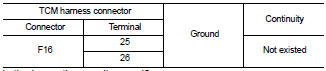 Check continuity between TCM harness connector F16 terminals 25, 26 and ground.