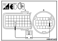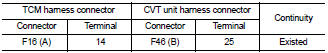 3. Check continuity between TCM harness connector F16 (A) terminal 14 and CVT unit harness connector F46 (B) terminal 25.