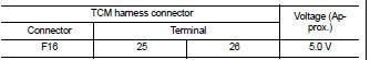 2. Check voltage between TCM harness connector F16 terminal 25 and 26.