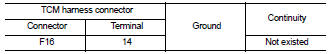 Check continuity between TCM harness connector F16 terminal 14 and ground.