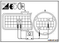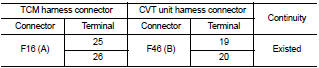 3. Check continuity between TCM harness connector F16 (A) terminal 25, 26 and CVT unit harness connector F46 (B) terminal 19, 20.