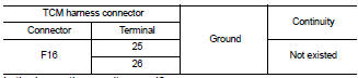 Check continuity between TCM harness connector F16 terminal 25, 26 and ground.