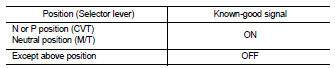 When the selector lever position is Neutral position, park/neutral position (PNP) switch is ON. ECM detects the position because the continuity of the line (the ON signal) exists (M/T models).