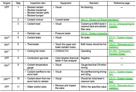 Check radiator cap. Refer to CO-11, "System Inspection".