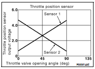 The throttle position sensor has two sensors. These sensors are a kind of potentiometers which transform the throttle valve position into output voltage, and emit the voltage signal to the ECM. In addition, these sensors detect the opening and closing speed of the throttle valve and feed the voltage signals to the ECM. The ECM judges the current opening angle of the throttle valve from these signals and the ECM controls the throttle control motor to make the throttle valve opening angle properly in response to driving condition.