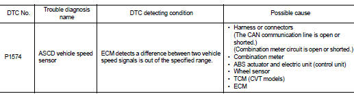 Nissan Altima (L32) 2007-2012 Service Manual: P1574 ASCD Vehicle speed sensor