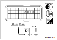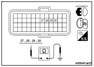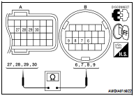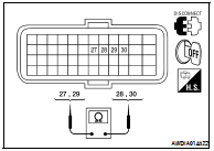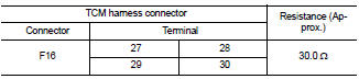 3. Check resistance between TCM harness connector F16 terminal 27, 29 and 28, 30.