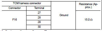 4. Check resistance between TCM harness connector F16 terminal 27, 28, 29, 30 and ground.