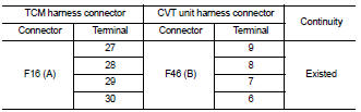 2. Check continuity between TCM harness connector F16 (A) terminal 27, 28, 29, 30 and CVT unit harness connector F46 (B) terminal 9, 8, 7, 6.