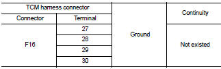 Check continuity between TCM harness connector F16 terminal 27, 28, 29, 30 and ground.