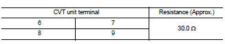 1. Check resistance between CVT unit terminal 6, 8 and 7, 9.