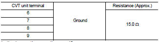 2. Check resistance between CVT unit terminal 6, 7, 8, 9 and ground.