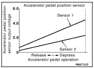 Accelerator pedal position sensor has two sensors. These sensors are a kind of potentiometers which transform the accelerator pedal position into output voltage, and emit the voltage signal to the ECM.