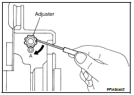 4. Remove adjuster hole plug installed on the disc rotor. Turn the adjuster in direction (A) using a suitable tool or a flat-bladed screwdriver as shown, until disc rotor is locked. Turn the adjuster in the opposite direction by 5 or 6 notches after locking.