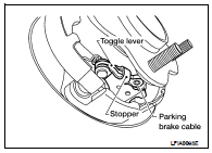 9. After adjustment, check that there is no drag while the control lever is being released. If drag exists, perform the following: • Remove the rear disc rotor. Refer to BR-35, "BRAKE CALIPER ASSEMBLY : Removal and Installation". Verify the toggle lever returns to stopper when the parking brake lever is released.