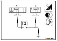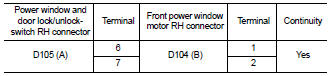 3. Check continuity between power window and door lock/unlock switch RH connector (A) and front power window motor RH connector (B).