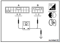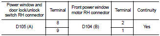3. Check continuity between power window and door lock/unlock switch RH connector (A) and front power window motor RH connector (B).
