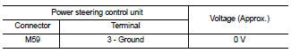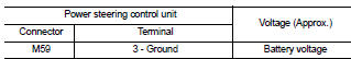 3. Check voltage between power steering control unit harness connector M59 terminal 3 and ground.