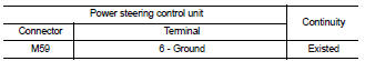 2. Check continuity between power steering control unit harness connector M59 terminal 6 and ground.