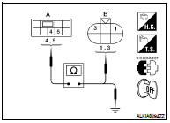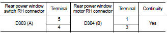 3. Check continuity between rear power window switch RH connector (A) and rear power window motor RH connector (B).