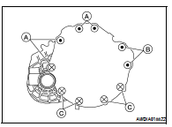 4. Remove the starter motor. Refer to STR-25, "Removal and Installation" (QR25DE), STR-51, "Removal and Installation" (VQ35DE).