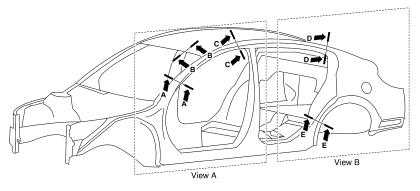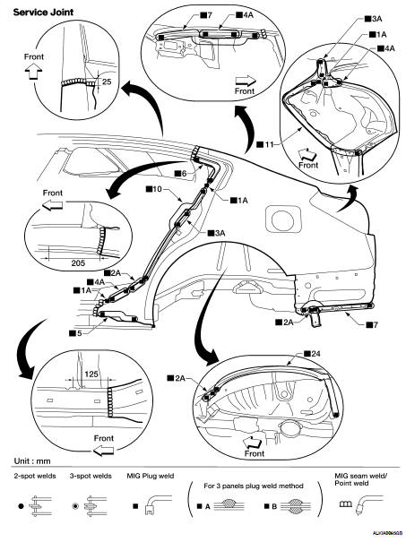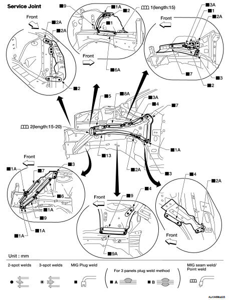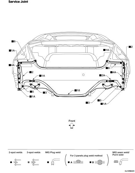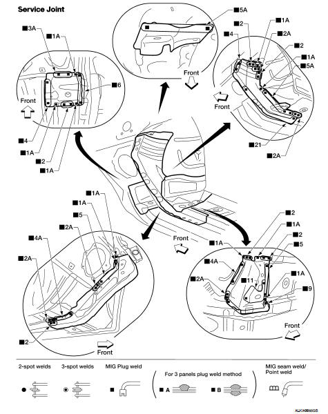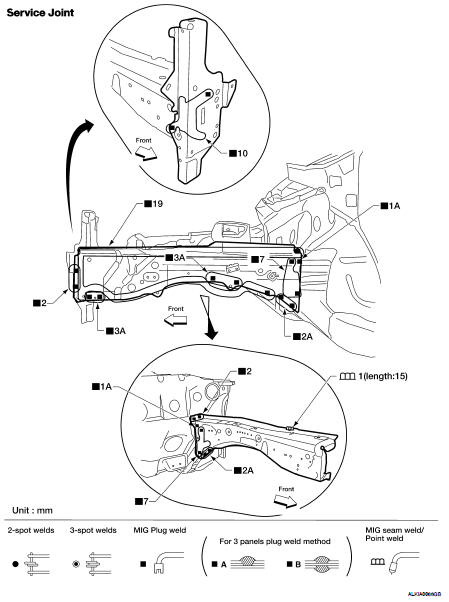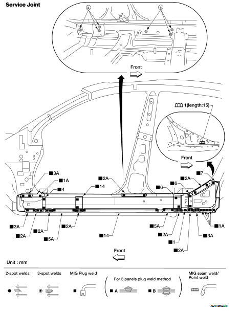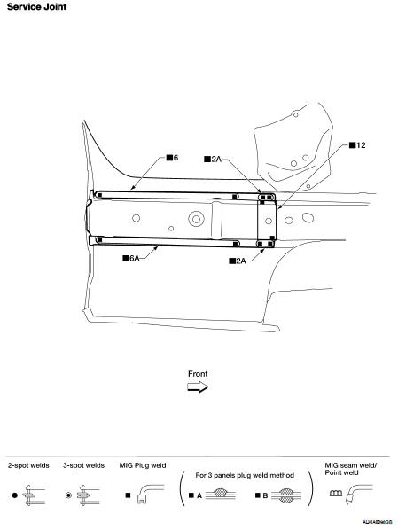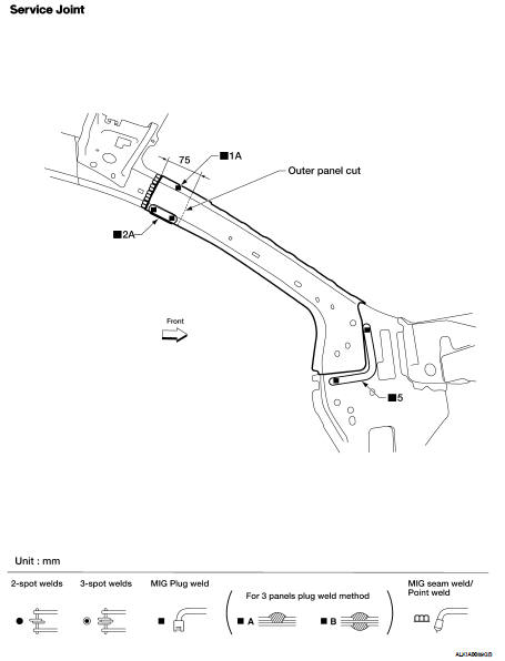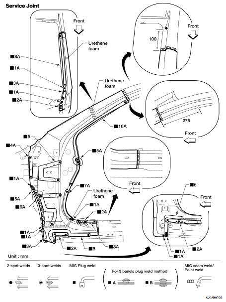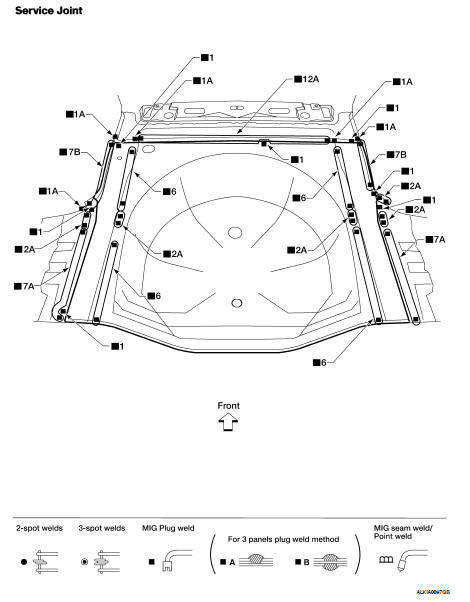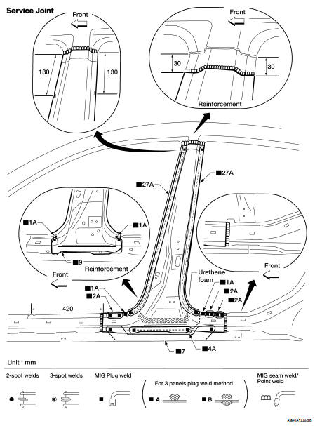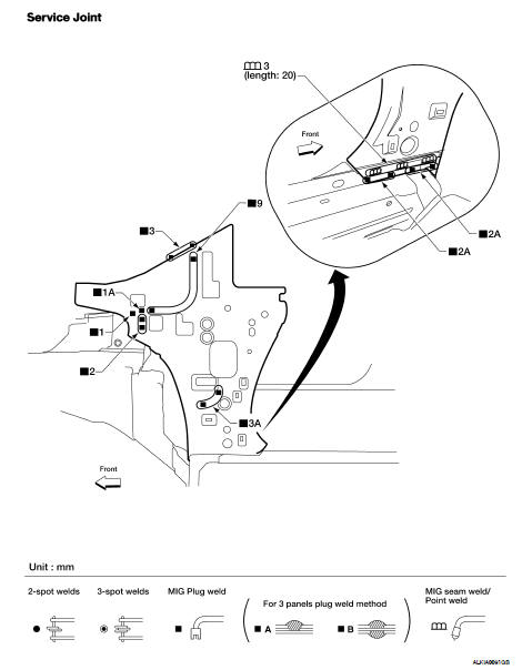 • Front pillar butt joint can be determined anywhere within shaded area as shown in the figure. The best location for the butt joint is at position A due to the construction of the vehicle. Refer to the front pillar section.